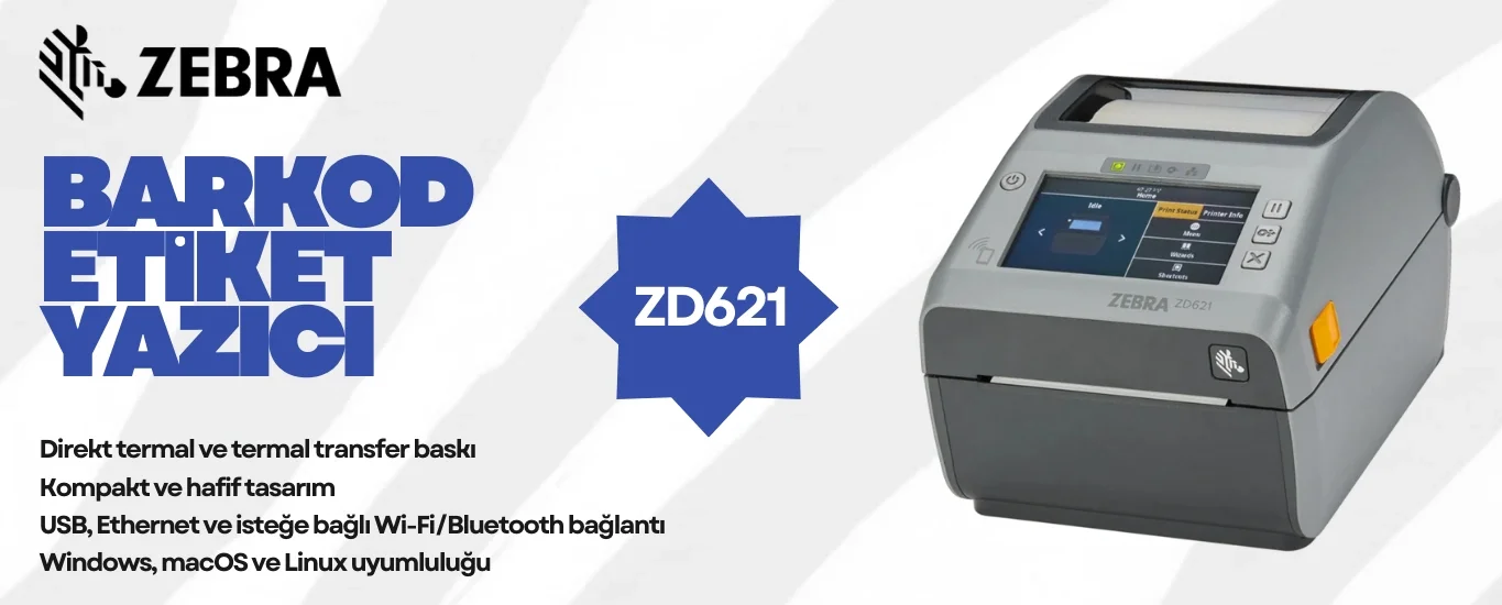 ZEBRA ZD621 Termal Transfer Barkod Etiket Yazıcı 4.3" Renkli Dokunmatik LCD Ekran; 300 Dpi, USB, USB Host, Ethernet, Seri, WiFi Kablosuz, Bluetooth BT4, Etiket Sıyırıcı, Model No: ZD6A143-31EL02EZ